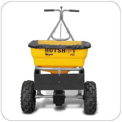 For a heavy-duty broadcast spreader built for all-season use, look to the Meyer Hotshot. Meyer Hotshots are compact, easy to maneuver and built to handle the extreme conditions of year-round use. Hotshots are designed to apply a variety of materials including top-dress sand, rock salt and ice melt on snow and ice, as well as limestone and fertilizer. Maximum spread range is from 3.6m (12') to 5.4m (18'), depending on the model.