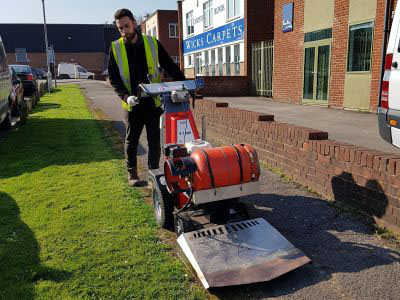 The HOAF pedestrian burners are balanced very well, which results in simple operation. The gas consumption can be adjusted using the gas control valve which results in gas efficient operation. Thanks to the low burner cover it is possible to easily burn under benches. The ThermHIT 75 uses Liquid Propane Gas bottles with liquid off-take available from Calor Gas in 12kgs. The bottle trolley is built into the machine, which makes light work of transporting the gas supply.
